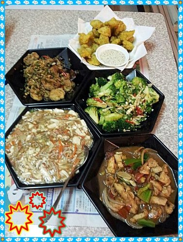 今天的員工餐菜單為『醋溜金針燴豆腐』、『金莎花椰』、『鮮採杏鮑菇香料鹽』、『酥炸杏鮑菇』、『香檸雞肉』。其中『金莎花椰』是店內的菜單之一,金莎其實就是鹹鴨蛋,整道料理吃起來鹹鹹辣辣的,非常下飯。