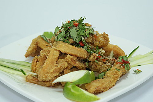 泰式椒麻花枝~~新鮮的花枝裹上獨家香料漿外皮酥脆花枝軟嫩淋上自行調配的泰式醬汁 酸酸甜甜辣辣 保證醫定讓你一口接一口~~