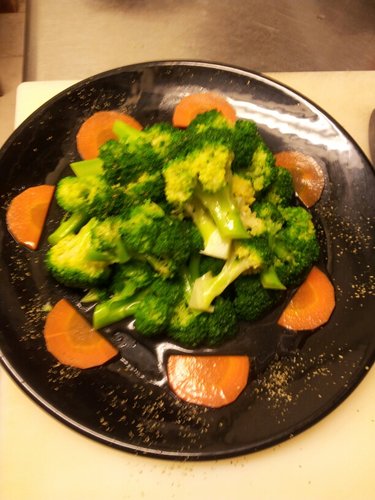 ,將花椰菜切成 50元硬幣大小與紅蘿蔔片下去川燙 至 水有淡綠色<大火約一分即可起鍋>。